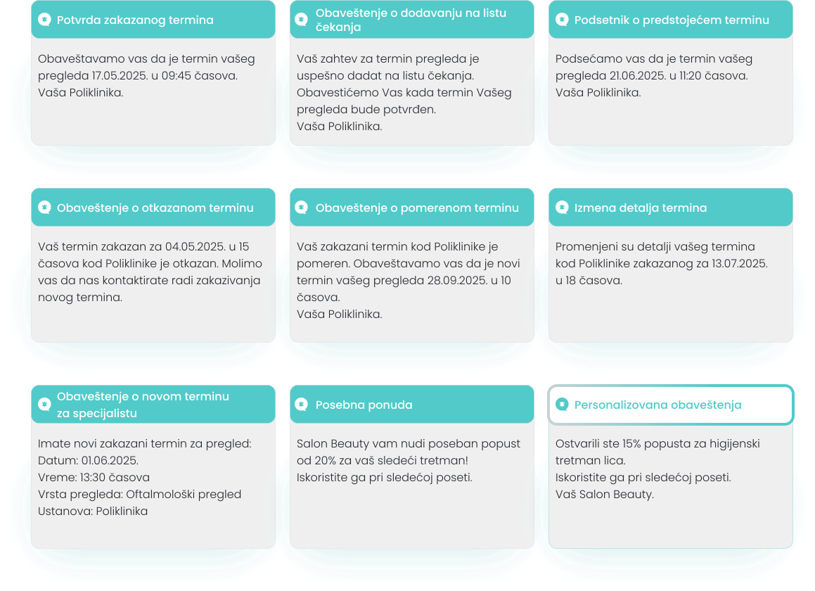Prilagodite sadržaj poruka prema vašim potrebama. Kreirajte šablone za različite tipove pregleda, odeljenja ili specijalnosti.